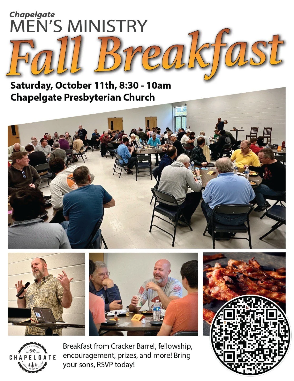 Join us at Chapelgate on Saturday, October 11th at 8:30am-10:30am for the next Men's Ministry Breakfast.