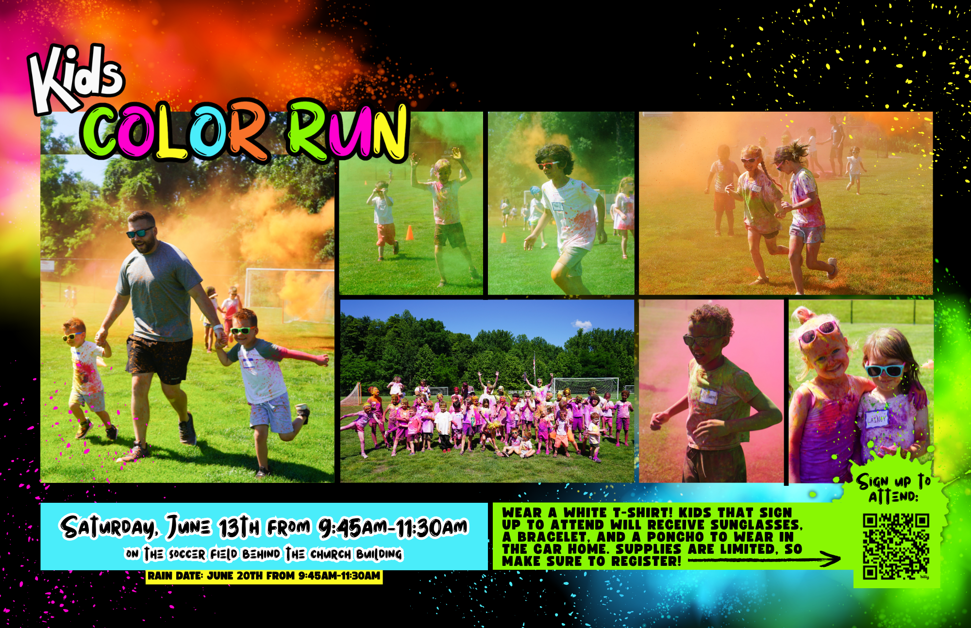 Join us on Saturday, June 13th at 9:45am behind the church building at the soccer field for our fourth Kids Color Run for kids ages 3 years old to 5th grade! Please have your child wear a white (or light colored) t-shirt to show off the colored powder! Don't worry - the color washes off easily in the wash.