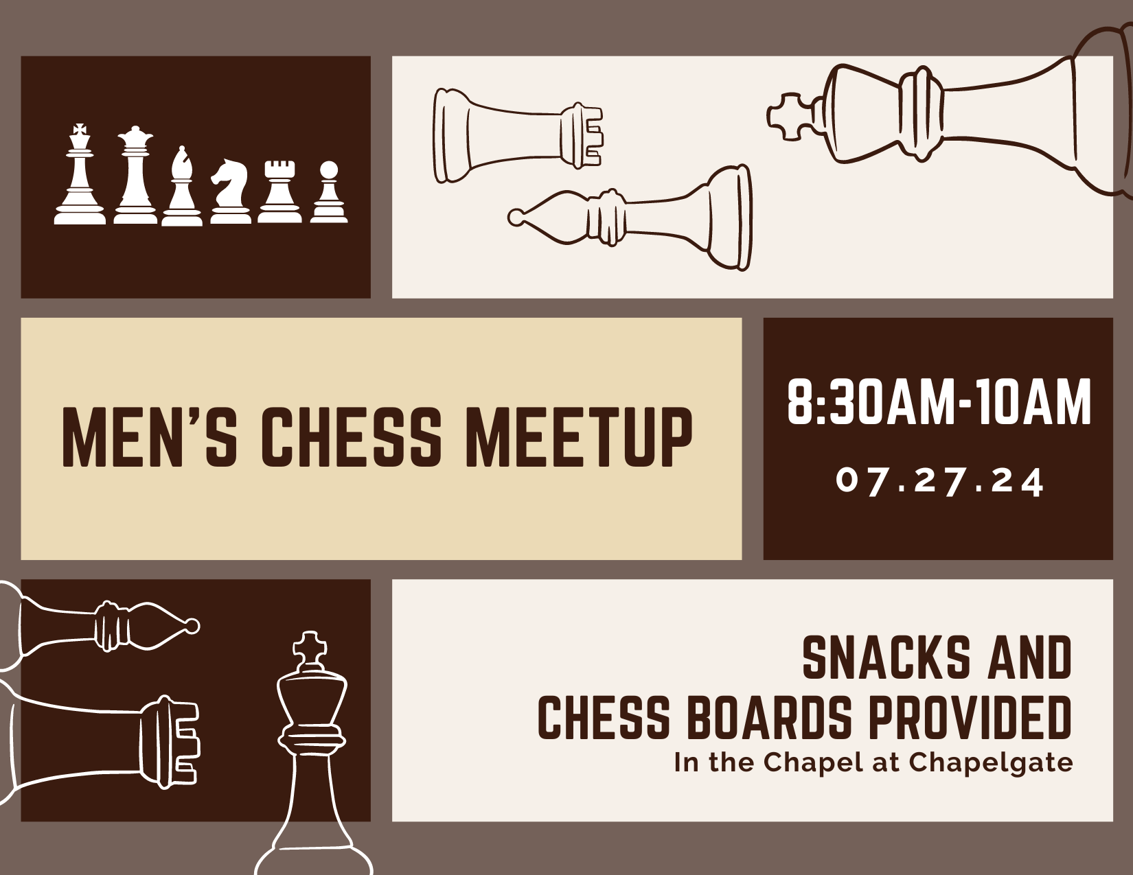 Join the Chapelgate Men’s Ministry on Saturday morning, July 27th, from 8:30am to 10:00am for an open play chess tournament. Everyone can play everyone for practice with your moves and for bragging rights. All skill levels welcome! This is a great chance for fathers and sons to participate together.