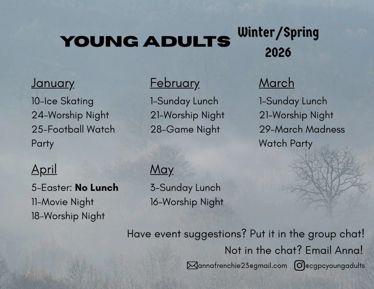 We know the importance of community and building friendships for Young Adults. Different members of our group host pop up events throughout the year. These are low-commitment opportunities to meet one another and spend some time in fellowship.